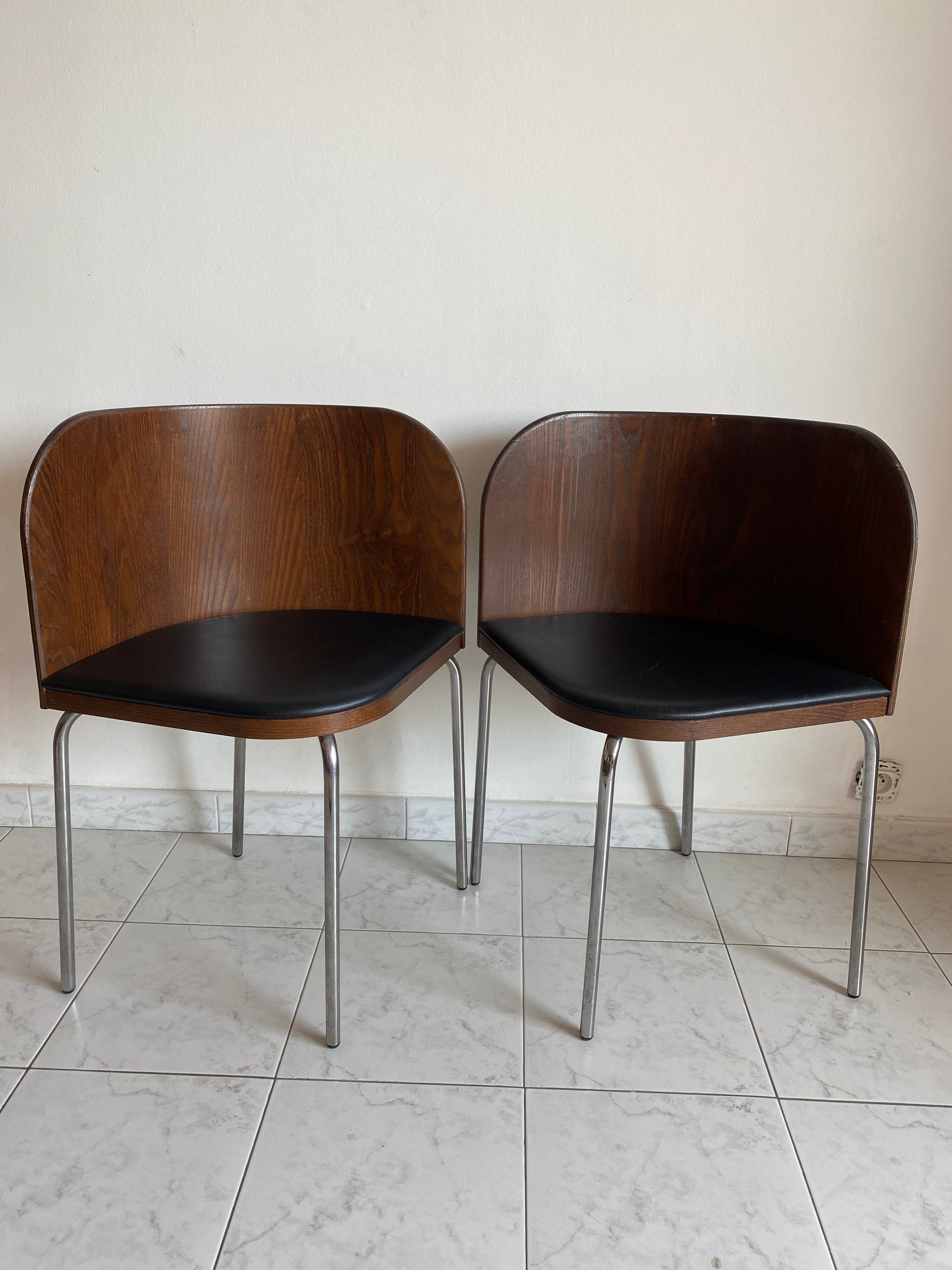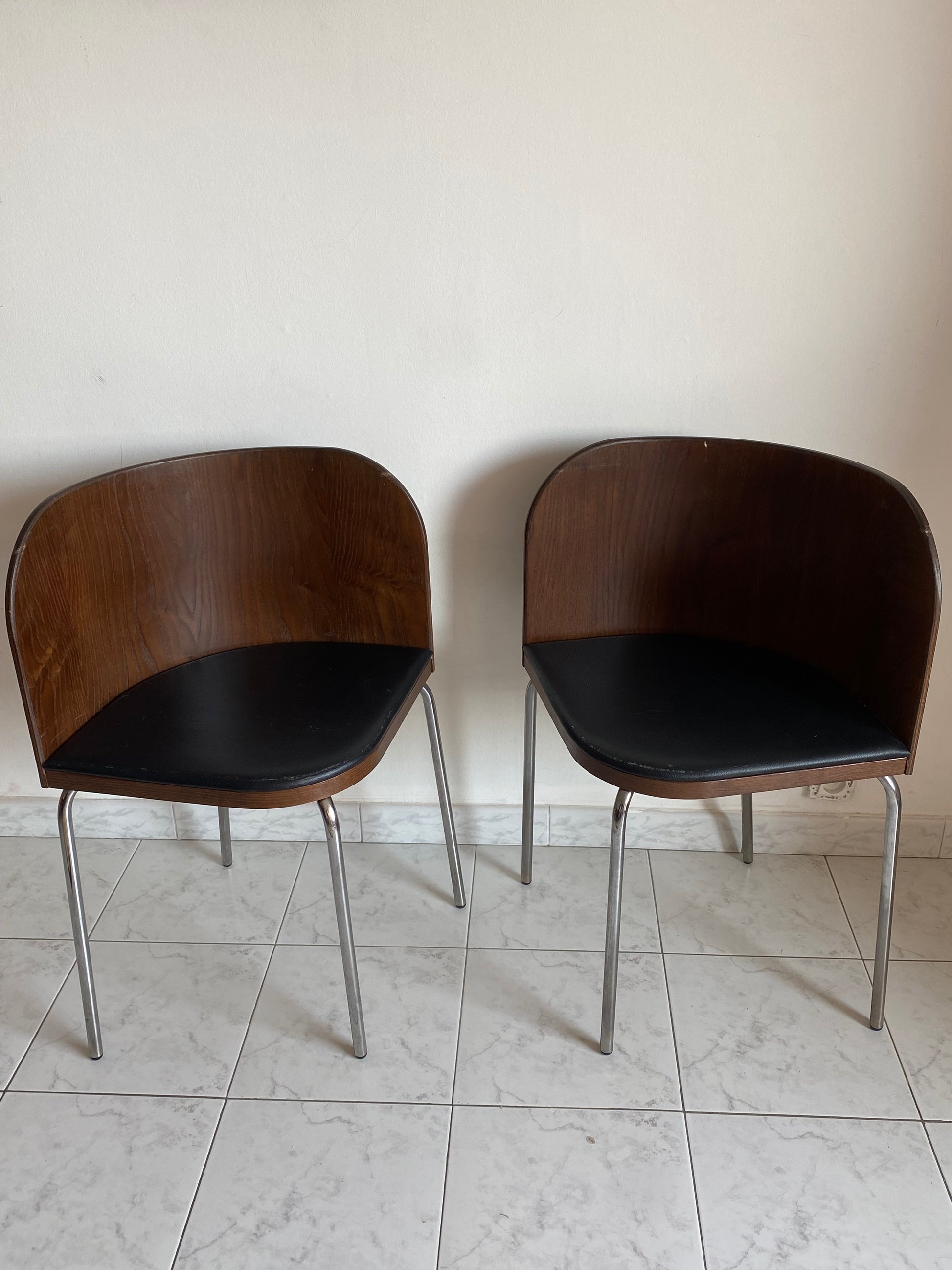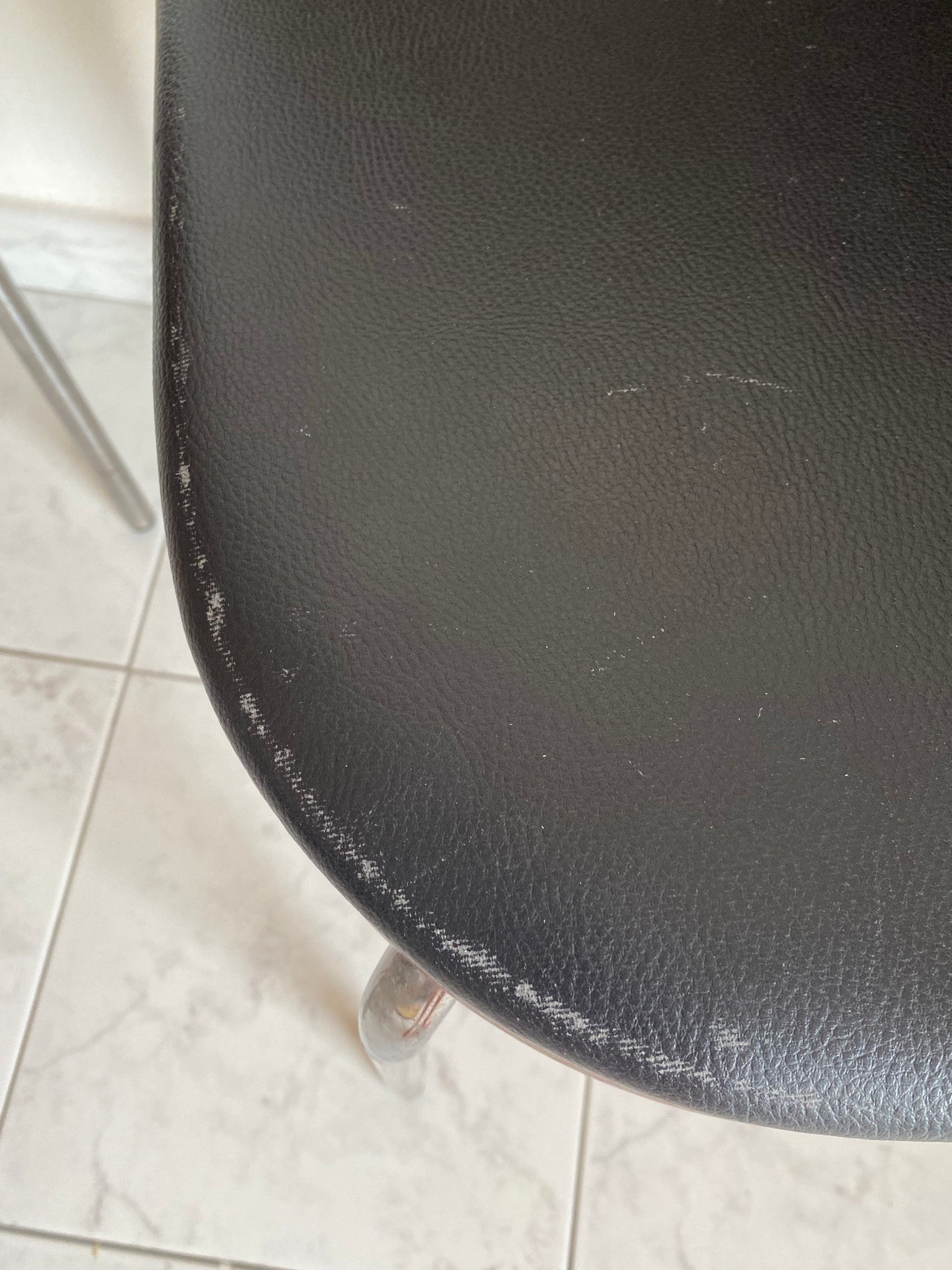 Les 4 chaises sont confortables grâce à leurs assises en cuir noir. Les pieds sont en métal chrome.